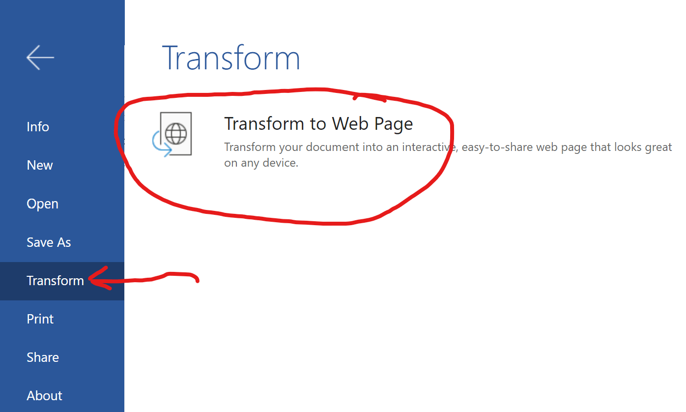 Use the File menu and choose “Transform.” You then have the option to “Transform to Web Page.” This does NOT do anything to your Word document, it simply takes your content and gets you started with a web page of your ideas! Why give students text based directions documents when you can SWAY!