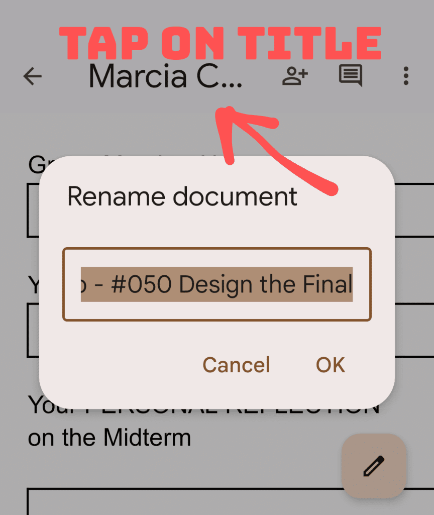 This is actually not universal across mobile apps. At the top center is the document title, or lack thereof. Use your finger to tap on the title to rename the file.