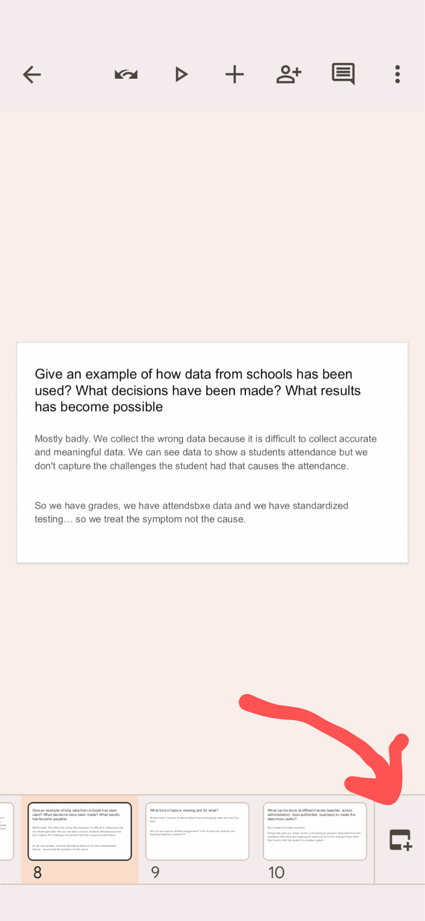 Use the plus icon at the top to insert elements onto the slide. One of my favorite reasons to use Google Slides on my phone is the ability to add pictures directly onto a slide. I can choose to use the image gallery or take a picture that is inserted right onto the slide.